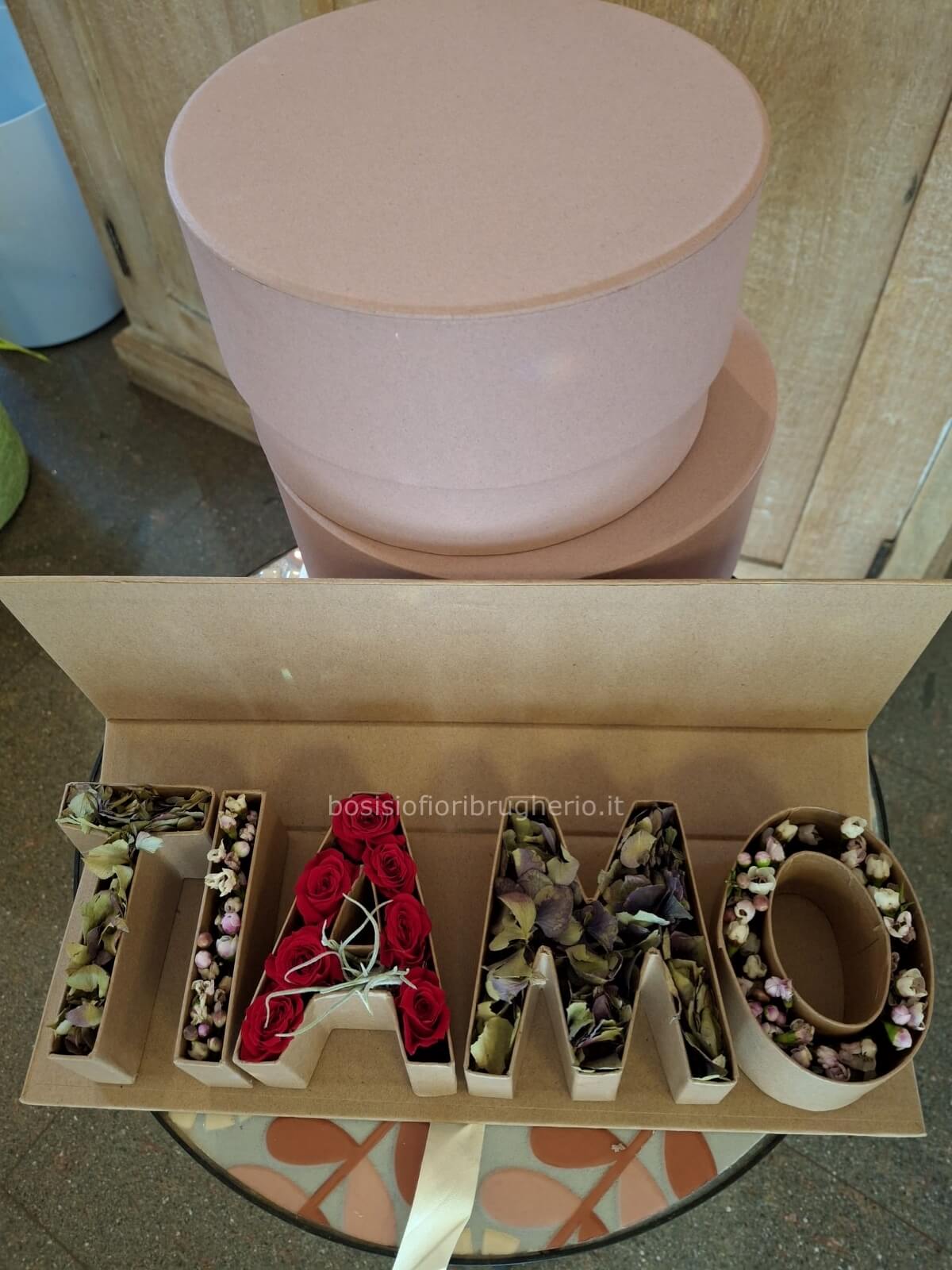 | Scritta Ti amo 34 x11 cm con fiori misti stabilizzati Cod. 124082 | € 50,00 | Quantità : | |