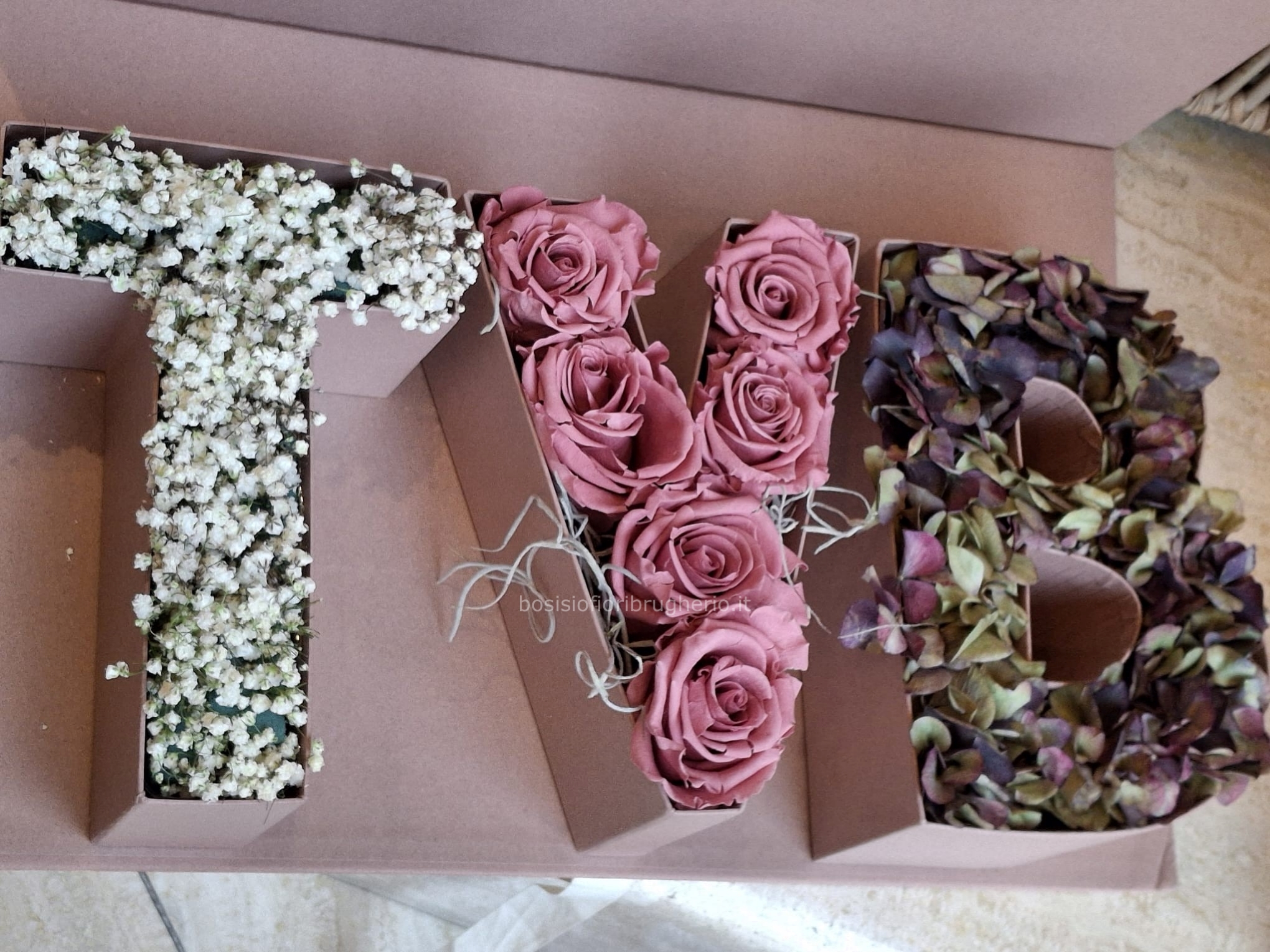 Scritta TVB 44 x21 cm con fiori misti stabilizzati